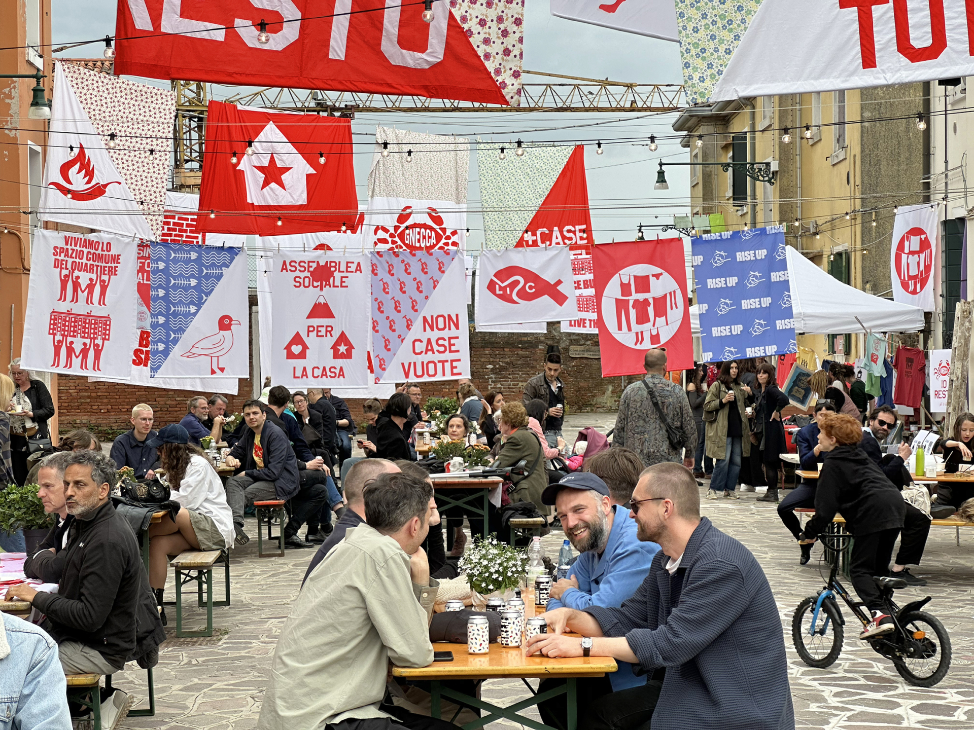 As the German Pavilion’s opening event an inclusive neighbourhood party was organised at Casette. This “sagra” questioned the traditional glamorous Biennale opening parties. Everyone was invited, no registration required. The event replaced the traditional exclusive Biennale opening party and brought together local residents, activists, and guests of the Pavilion.