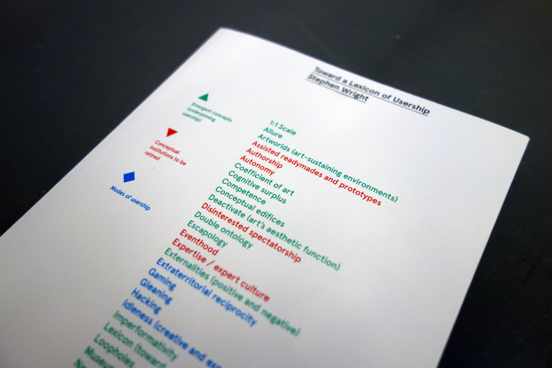 A lexicon of terms was been written by theorist Stephen Wright for the Museum of Arte Útil and can serve as a textual tool kit. The lexicon includes terms that Wright feels should be ‘retired’ alongside what he refers to as ‘emergent concepts’ and ‘modes of usership.’ Stephen Wright is a writer and professor at the European School of Visual Arts.