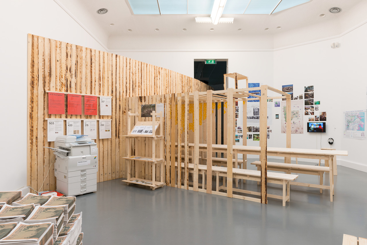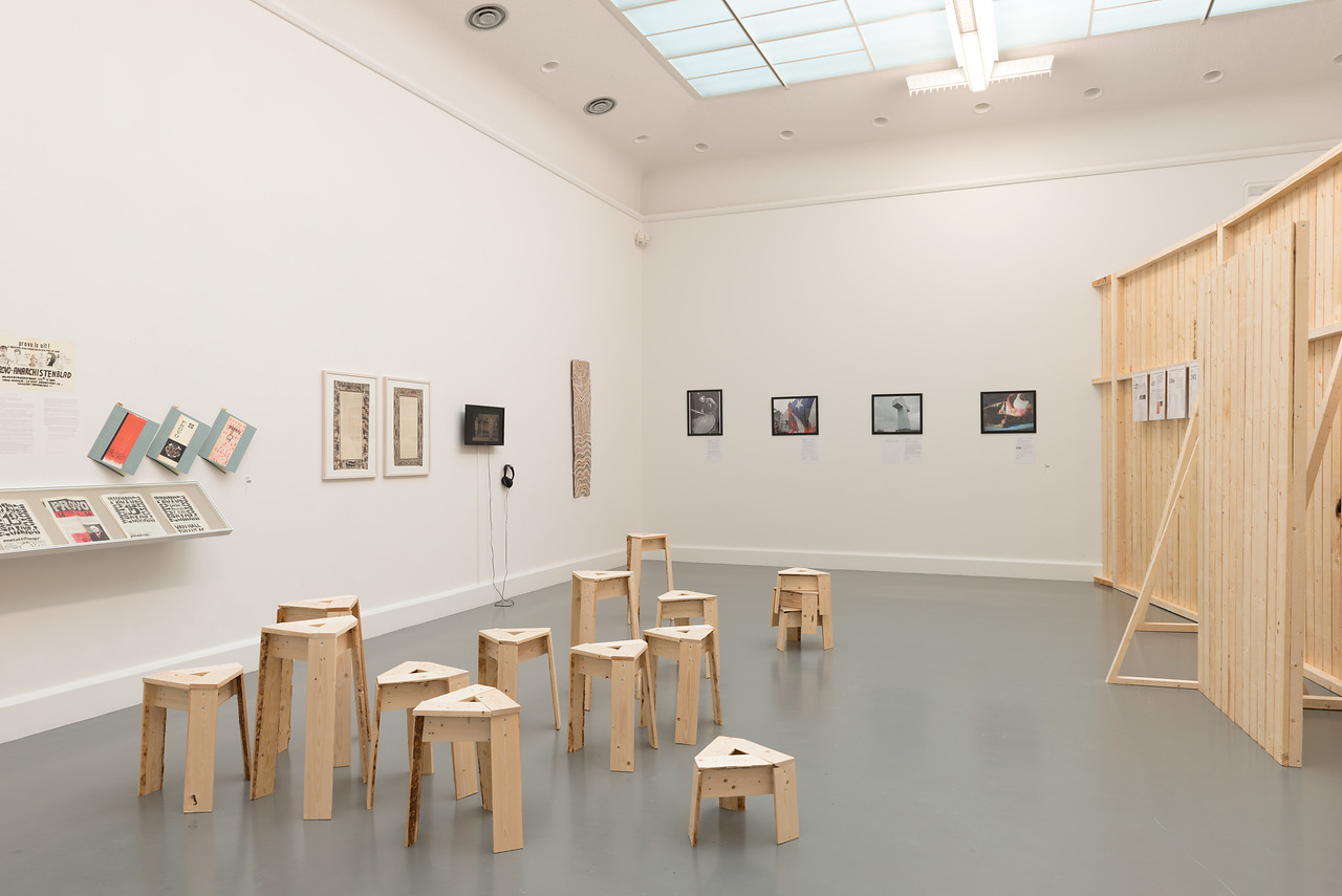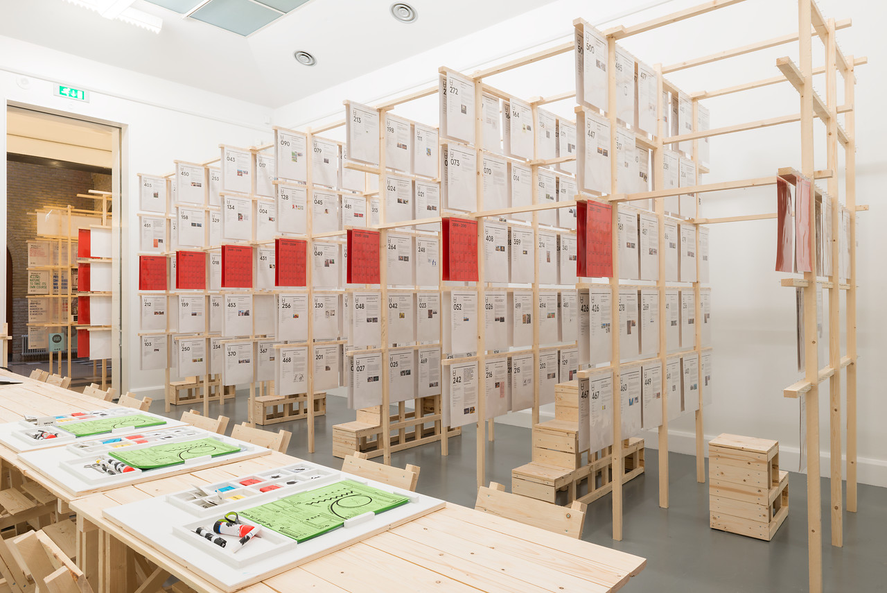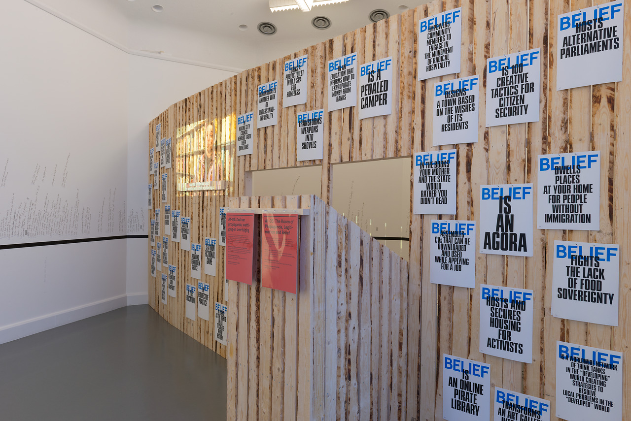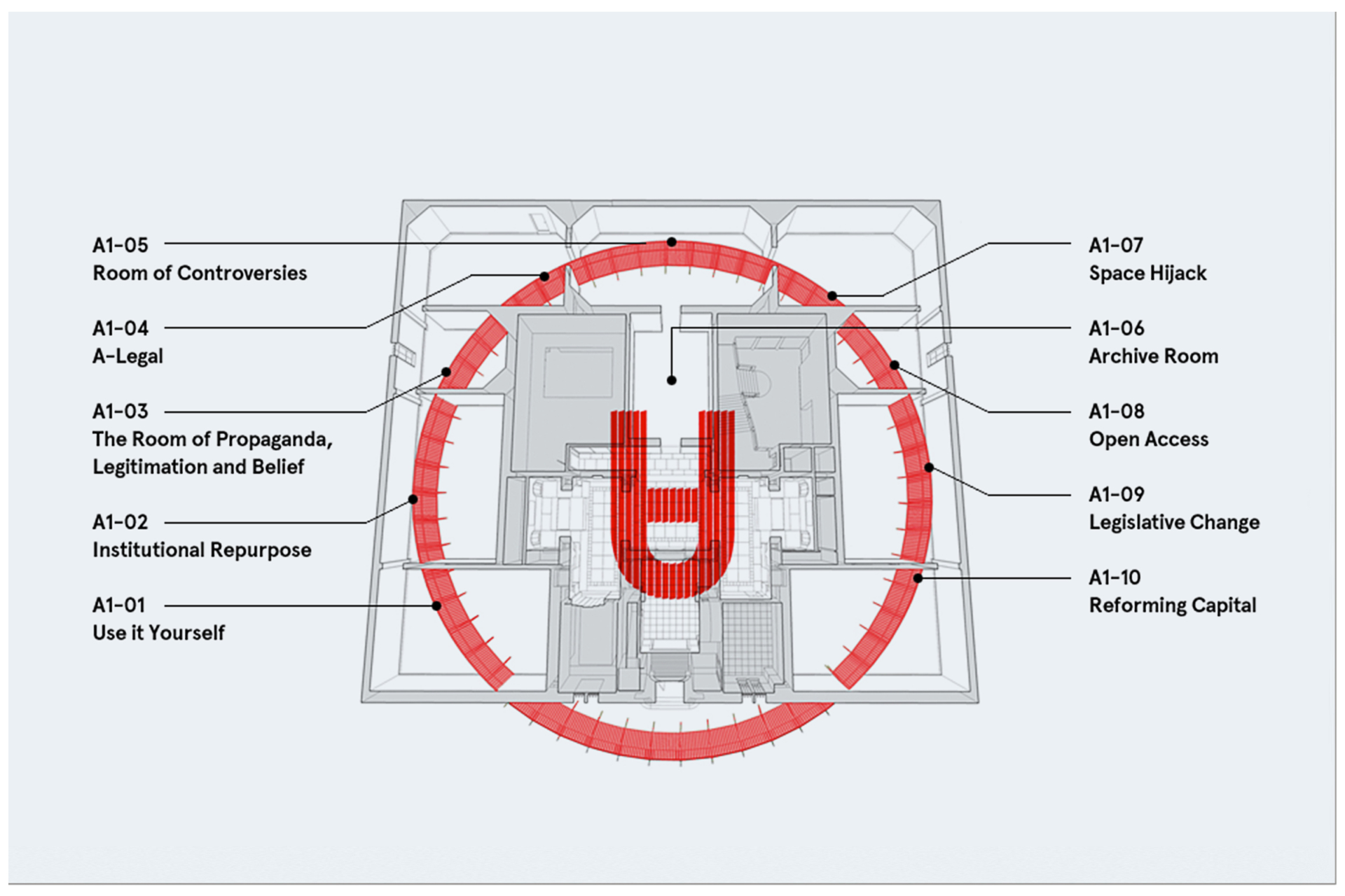 The white walls of the museum were challenged by an alternative spatial support structure; a circular wooden wall that cut straight through all the existing “white cube” exhibition-space. A series of case studies were presented through the lens of seven strategies: Use it Yourself, Institutional Repurpose, A-Legal, Space Hijack, Open Access, Legislative Change and Reforming Capital. Every strategy was connected to an individual room and customised infrastructure. Infrastructure that derived from the circular wooden wall. Three additional rooms with accompanying infrastructure were added for analysis; The Room of Propaganda, Legitimation and Belief, the Room of Controversies and the Archive Room.